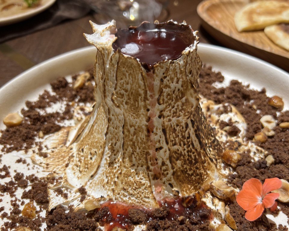 Подача десерта в виде извергающегося вулкана на основании из жидкого шоколада была просто восхитительной. В ресторане не подают алкоголь. Но есть безалкогольные вина, которые правда мало чем отличаются от алкогольных.