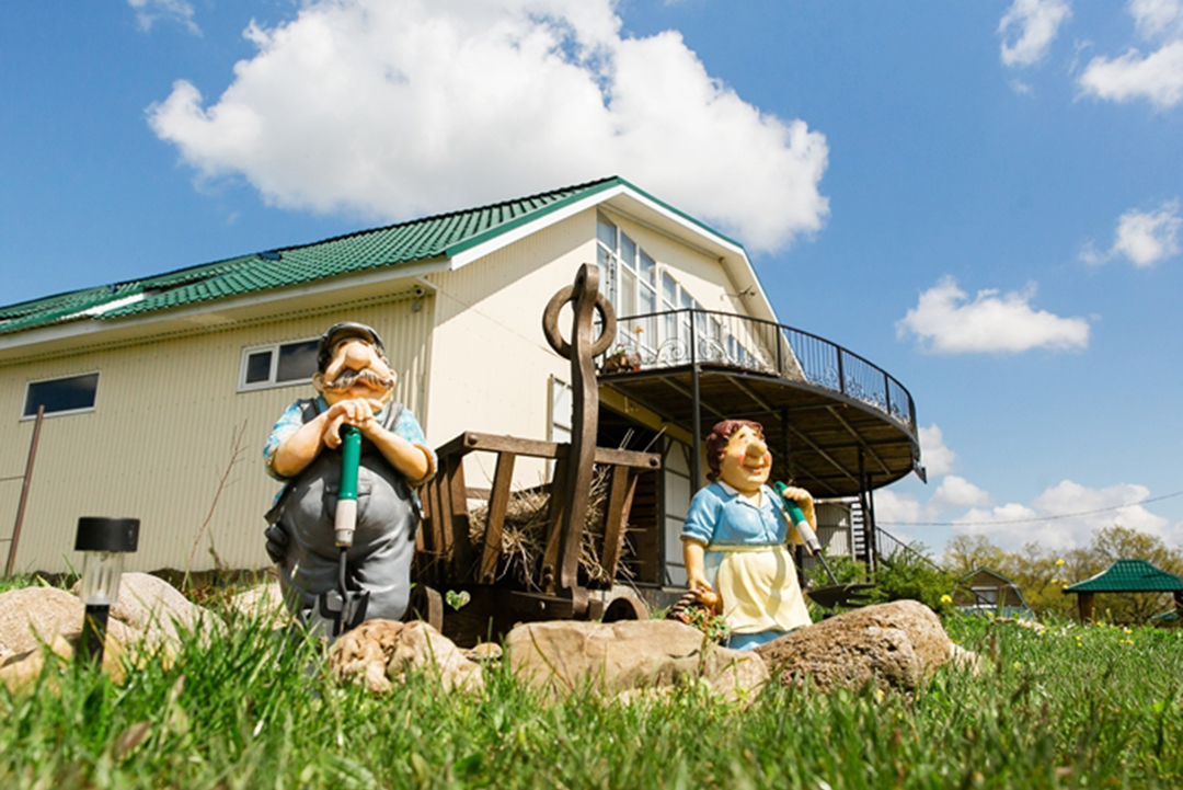 Вы можете забронировать домик на ферме, причем выбрать любой, который вам больше по душе. Вас ждет домашний ресторан, где готовят из продуктов собственного производства. А после – русская баня на дровах, массаж, летний бассейн и чан на открытом воздухе.