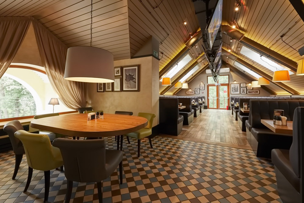 В ресторане и на баре шикарный выбор недорогого пива. Можно просто зайти пропустить пинту – другую свежего пивка. Кстати, и оформление залов выполнено в приглушённых тонах - мужское, сдержанное, напоминает не лишённый уюта подвал. В тёплое время года работает большая веранда.