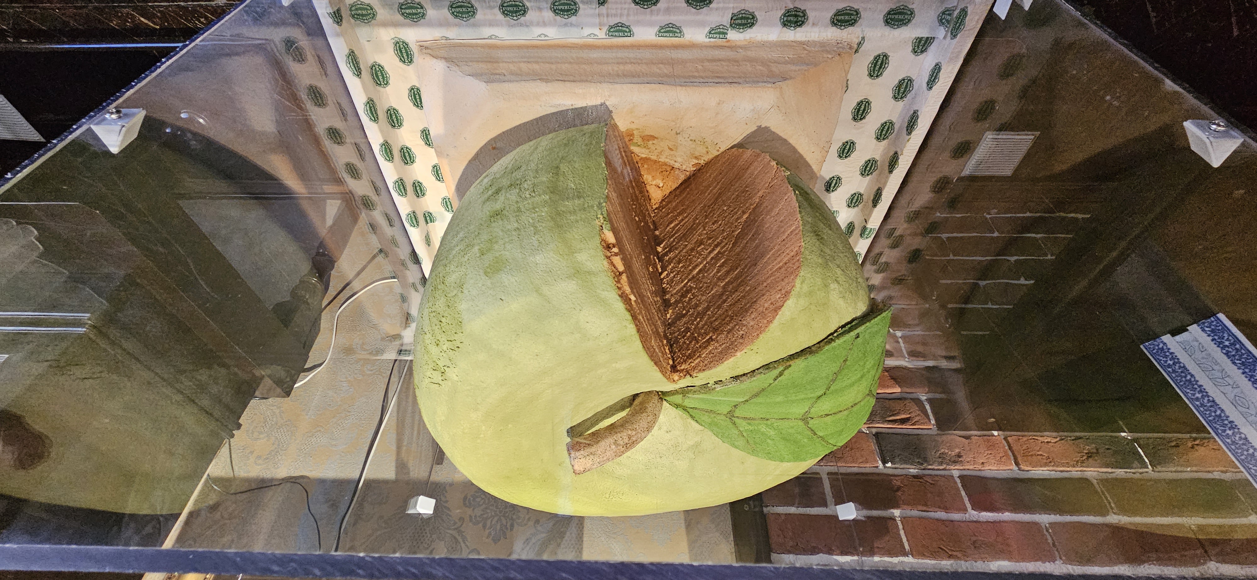 В музее в 2023году выставлен и гастрономический шедевр – 40- килограммовый экземпляр натуральной Белевской пастилы. Его приготовили в дар делегации из Китая, но пирог был такой большой, что не смогли его забрать гости. В итоге осталась пастила в виде огромного яблока в дар родному городу. На экскурсии вам расскажут, что хоть и почти воссоздали старинный рецепт яблочного лакомства, но повторить рецепт 19-го века со 100% идентичностью так и не удалось. Причина тому – сорт яблок Антоновка, используемый при изготовлении пастилы, сейчас совсем другой. Старые деревья извели, а плодоносящие новые – уже не те.