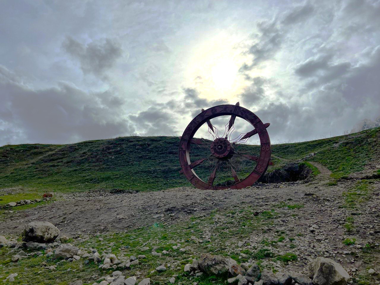 Сытые и довольные едем дальше. И совсем рядом с горным селением Даргавс находим еще один арт-обьект Нартского эпоса – «Колесо Балсага». Кто-то скажет: «Колесо судьбы», кто-то назовет его «Колесом Солнца». В любом случае это один из символов уже упомянутого Нартского эпоса.